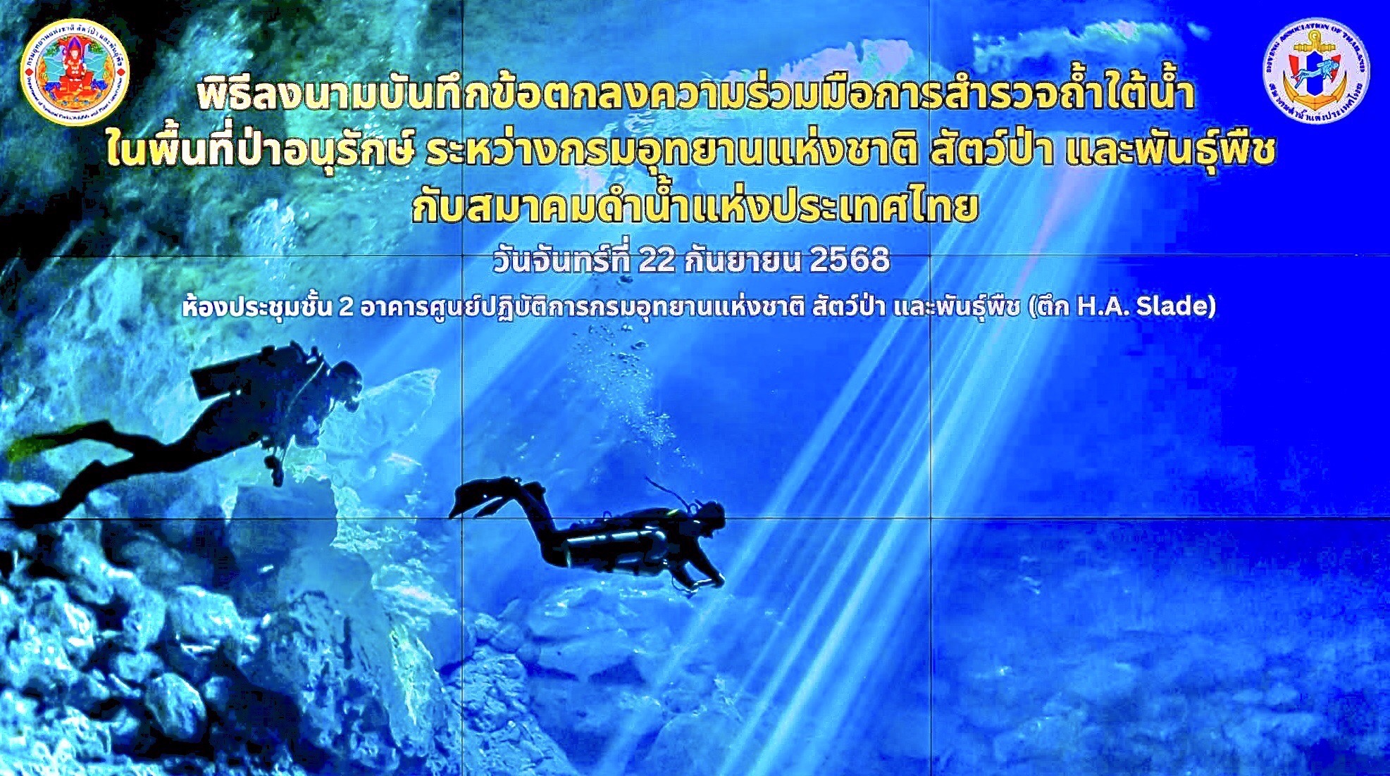 ประเทศไทย เป็นดินแดนที่อุดมสมบูรณ์ไปด้วยความหลากหลายของธรรมชาติ ทั้งบนผืนดินและใต้ผืนน้ำ แต่ก็ยังมีอีกหลายพื้นที่ที่เรายังไม่รู้จัก และไม่มีข้อมูลที่ถูกต้อง เช่น เรื่องของ “ถ้ำใต้น้ำ” ที่ไม่ค่อยมีมนุษย์เข้าถึงมากนัก การสำรวจถ้ำใต้น้ำ เป็นการสำรวจที่ต้องใช้ผู้เชี่ยวชาญ และมีความสามารถในการดำน้ำในถ้ำ ซึ่งถือเป็นการดำน้ำทางเทคนิคเคิล ที่แตกต่างจากการดำน้ำสันทนาการทั่วไป เมื่อนักดำน้ำเทคนิคเคิล(ดำน้ำถ้ำ) มาทำงานร่วมกับเจ้าหน้าที่ผู้ดูแลพื้นที่ธรรมชาติทั้งทางบกและทางทะเล ของกรมอุทยานแห่งชาติสัตว์ป่า และพันธุ์พืช เพื่อทำการสำรวจถ้ำใต้น้ำทั้งบนบกและในทะเล เก็บข้อมูลทรัพยากรธรรมชาติที่ค้นพบ อันจะนำไปสู่การจัดวางแผนการจัดการพื้นที่ต่อไปในอนาคต วันที่ ๒๒ กันยายน ๒๕๖๘ สมาคมดำน้ำแห่งประเทศไทย นำโดย พลเรือเอก อาภากร อยู่คงแก้ว นายกสมาคมดำน้ำแห่งประเทศไทย และ นายอรรถพล เจริญชันษา อธิบดีกรมอุทยานแห่งชาติ สัตว์ป่า และพันธุ์พืช จึงร่วมลงนามบันทึกข้อตกลงความร่วมมือ (MOU) การสำรวจ และการจัดทำฐานข้อมูลทรัพยากรธรรมชาติถ้ำใต้น้ำในพื้นที่ป่าอนุรักษ์ทั่วประเทศ เพื่อเตรียมความพร้อมที่จะก้าวไปสู่การยกระดับมาตรฐานการสำรวจถ้ำใต้น้ำ ด้วยเทคนิคการดำน้ำขั้นสูง โดยมี นายวีระ ขุนไชยรักษ์ รองอธิบดีกรมอุทยานแห่งชาติ สัตว์ป่า และพันธุ์พืช, พลเรือตรี อนันท์ สุราวรรณ์ เลขานุการสมาคมดำน้ำแห่งประเทศไทย, นายอริยะ เชื้อชม ผู้อำนวยการสำนักอุทยานแห่งชาติ, นางวนบุษป์ อรรถวิทย์ นักวิชาการป่าไม้ชำนาญการพิเศษ/ผู้อำนวยการส่วนจัดการท่องเที่ยวและนันทนาการ, นางสาวณัฐธยาน์ ศรีบุญเรือง นักวิชาการป่าไม้ชำนาญการ, คณะกรรมการสมาคมดำน้ำแห่งประเทศไทย, นายปรสุ โกมารทัต ประธานคณะทำงานฝ่ายดำน้ำเทคนิคัล และคณะทำงานฝ่ายดำน้ำเทคนิคัล ร่วมเป็นสักขีพยาน คณะทำงานจะเลือกพื้นที่นำร่องที่มีศักยภาพ ได้แก่ ถ้ำในอุทยานแห่งชาติธารโบกขรณี, อุทยานแห่งชาติเขาสก, อุทยานแห่งชาติหาดนพรัตน์ธารา - หมู่เกาะพีพี, อุทยานแห่งชาติเขาแหลม, อุทยานแห่งชาติถ้ำหลวง-ขุนน้ำนางนอน และเขตห้ามล่าสัตว์ป่าหนองปลักพระยาและเขาระยาบังสา ซึ่งเต็มไปด้วยความลึกลับ สวยงาม และรอการสำรวจในไม่ช้านี้